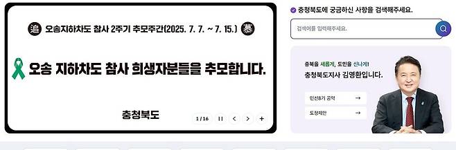 | ▲ 충북도청 홈페이지. 충북도는 지난 7일부터 15일까지 9일 동안 오송참사 추모기간을 설정하고 직원들에게 음주 자제령을 내렸다. |