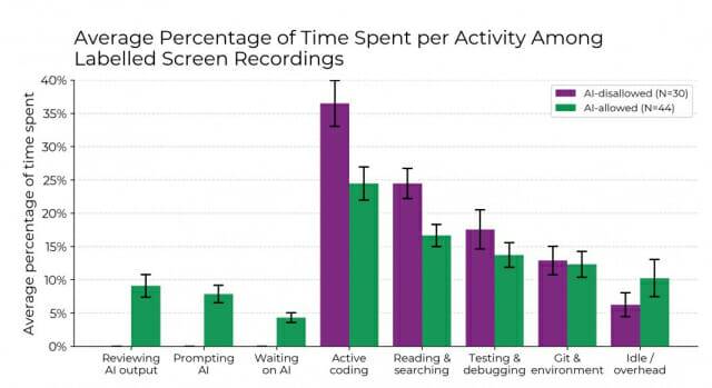 연구진은 개발자들이 실제로 어떻게 시간을 보내는지 알아보기 위해 143시간 분량의 화면 녹화를 꼼꼼히 분석했다. 결과는 놀라웠다. AI를 사용할 때 개발자들은 정작 코딩하는 시간과 자료를 찾는 시간은 줄어들었다. 대신 AI가 만든 코드를 검토하고, AI에게 무엇을 할지 설명하고, AI가 답을 만들어낼 때까지 기다리는 시간이 늘어났다.