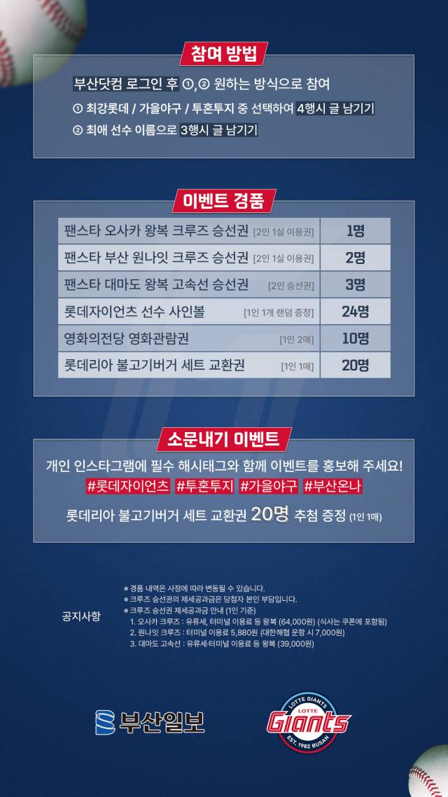 부산일보는 지난 11일부터 롯데자이언츠 포스트시즌 진출을 기원하는 응원 댓글을 남기면 크루즈 승선권과 롯데 선수 사인볼, 영화관람권, 햄버거 세트 교환권 등을 경품으로 지급하는 행사를 진행하고 있다.