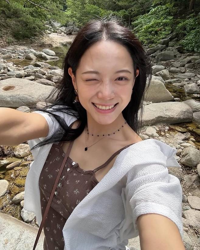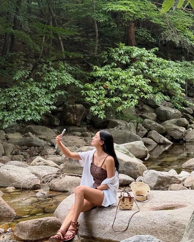 계곡 물가를 조심스럽게 걷는 김세정의 모습은 자연과 하나 된 듯한 여유로움을 전한다.