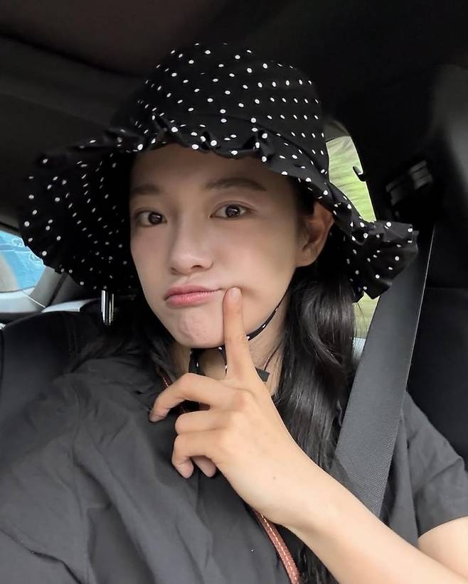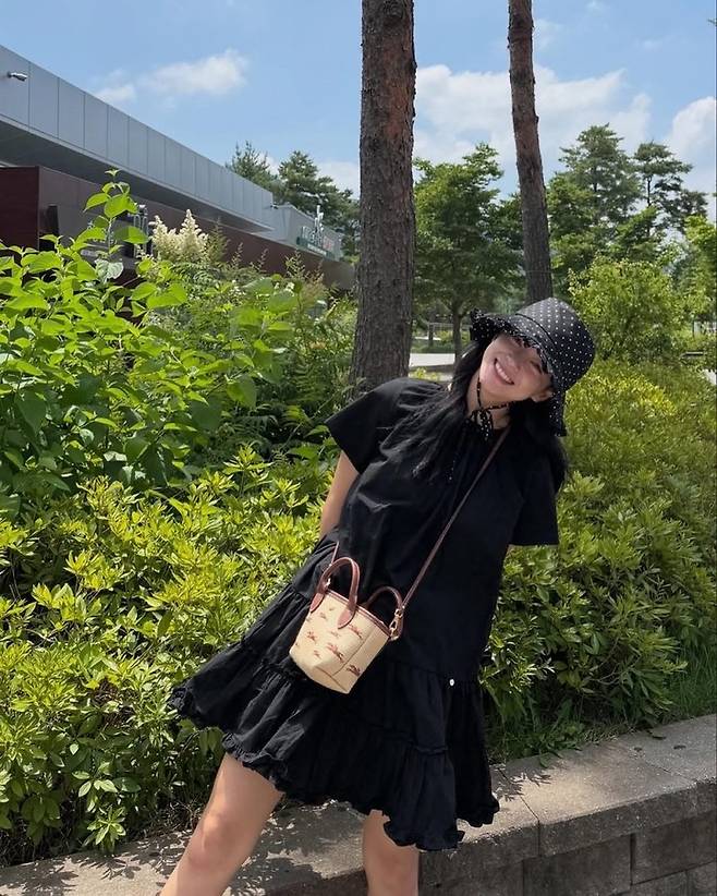 햇살 가득한 야외에서 김세정은 도트 버킷햇과 블랙 원피스를 착용한 채 활짝 웃고 있다. 캐주얼한 룩으로 편안한 분위기에서 그의 상큼한 미소가 룩의 생기를 더한다.