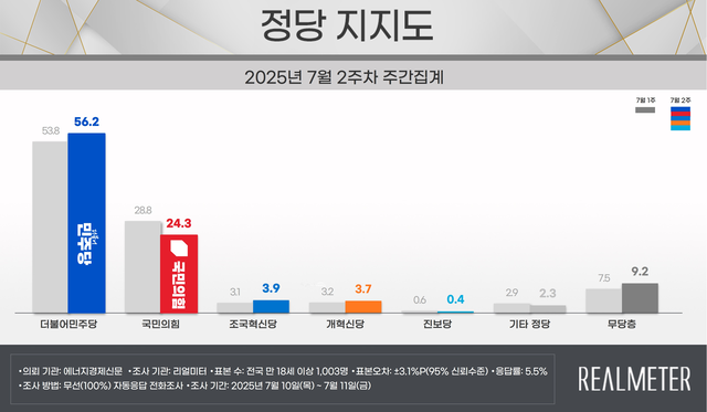 14일 공표된 리얼미터 7월 2주차 정당지지도 조사(에너지경제신문 의뢰·지난 10~11일·전국 성인 1003명·표본오차 95% 신뢰수준 ±3.1%포인트·무선 RDD·전화ARS·응답률 5.5%·이하 중앙선거여론조사심의위원회 홈페이지 참조)에선 더불어민주당이 지난주 대비 2.4%포인트 상승한 56.2%, 국민의힘은 4.5%포인트 떨어진 24.3%를 각각 기록했다.