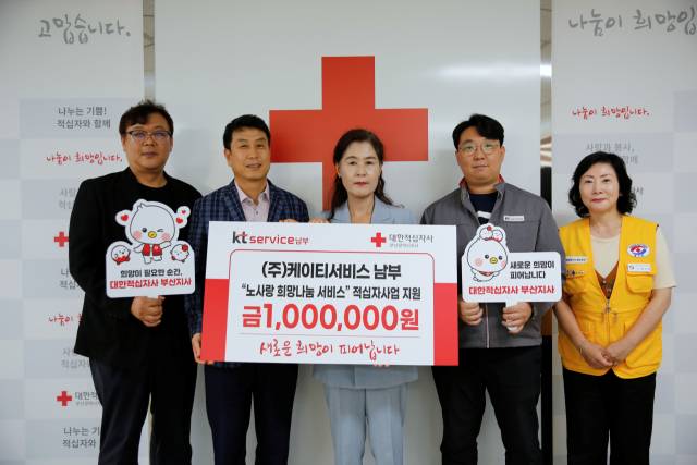 KT서비스남부는 ‘노사랑 희망나눔 서비스’라는 2025년 슬로건을 바탕으로 전 임직원과 노동조합이 뜻을 모아 적십자 인도주의 활동 지원을 위해 100만 원의 성금을 대한적십자사 부산지사(회장 서정의)에 전달했다.