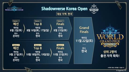 'Shadowverse Korea Open 2025'는 총상금 3,000만원 규모의 '섀도우버스 월즈 비욘드' 국내 첫 공식 대회로, 총 두 번의 정규 시즌을 거쳐 선발된 8인이 'Shadowverse World Grand Prix 2025' 참가 권리를 놓고 경쟁한다.