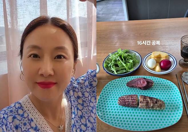 공개된 사진 속 식탁 위에는 삶은 달걀, 자색고구마, 찐 옥수수, 채소, 과일 등 건강한 음식으로 구성된 한 끼가 차려져 있다. 16시간 공복 후 맞이하는 첫 식사임에도 철저한 자기관리가 느껴진다.