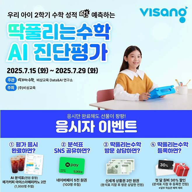 비상교육은 전체 응시자 중 1000명에게 커피 쿠폰 2잔을 제공하며, 분석표를 SNS에 공유하고 인증하면 네이버페이 5천 원권(100명 추첨)을 지급한다. 또한, 학습관에 분석표를 지참해 방문 상담을 완료하면 신세계 상품권 3만 원권이 지급되며, 등록 시 첫 달 수강료를 30% 할인해준다. AI 진단평가는 딱풀리는수학 공식 누리집(www.ddaksoo.com)에서 응시할 수 있다.