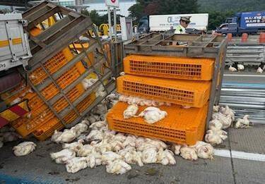 이 사고로 해당 화물차에 적재돼 있던 약 3천마리의 닭 중 수십 마리가 도로로 떨어졌다.