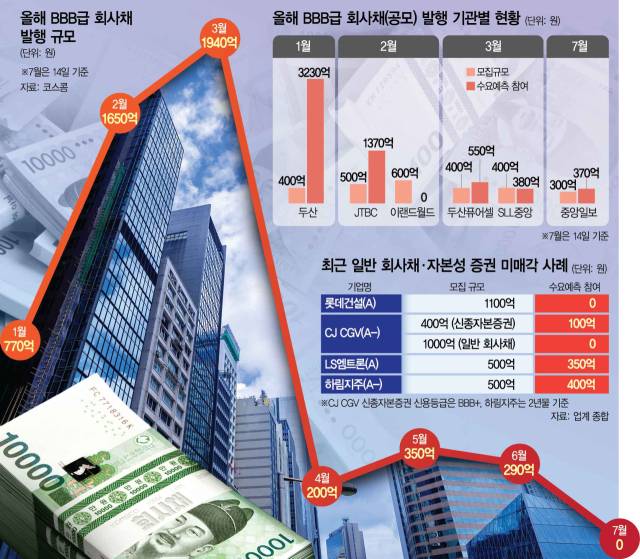 엎친 데 덮친 격으로 일부 기업의 경우 업황 부진까지 겹치며 회사채 투자 매력이 더욱 떨어지는 모양새다. 대표적인 기업이 롯데건설과 CJ CGV(079160)이다. 롯데건설은 지난달 1100억 원 규모의 회사채 수요예측에 나섰지만 단 한 건의 주문도 받지 못했다. CJ CGV는 이달 11일 1000억 원 모집에 나섰지만 전량 미매각됐다. 앞서 CJ CGV는 지난달 신종자본증권(BBB+) 수요예측을 진행했지만 400억 원 모집에 100억 원 규모의 주문만 들어왔다. 롯데건설과 CJ CGV의 신용등급은 각각 A, A-로 BBB등급보다 높지만 회사채 시장에서는 비우량 기업으로 분류된다. LS엠트론 역시 수요예측에서 2년물 기준 목표액을 채우지 못하며 기존 500억 원에서 350억 원으로 감액 발행했다.