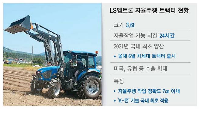 무게가 3t인 LS엠트론의 자율작업 트랙터 MT7은 2021년에 처음 개발됐다. 자율작업 트랙터는 드론 등에 쓰이는 초정밀 위치 정보 시스템 'RTK-GNSS'를 적용했다. 이에 따라 정지 상태에서 트랙터 위치 정밀도는 2㎝ 이내, 작업 시 최대 오차 7㎝ 이내의 정확도로 밭에서 작동할 수 있다. 작업 시간도 25% 단축한다. 지금은 사람이 탑승해야 하지만 관련 법규가 제정된다면 무인 농기계 시대가 올 수 있다.