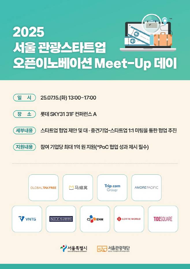 서울시와 서울관광재단이 관광 새싹기업의 새로운 도약을 지원하기 위해 15일 '2025 서울 관광새싹기업(스타트업) 개방형 혁신전략(Open Innovation) 교류의 날(Meet-up Day)'을 개최한다.