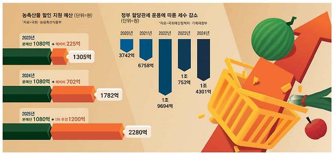 농수축산물 가격이 오를 때마다 정부가 수천억 원의 세금을 쏟아붓거나 관세를 깎아주면서 대규모 할인 행사를 벌여 진화에 나서지만, 이벤트가 끝나면 종전 가격으로 되돌아가는 상황이 반복되면서 세금으로 중간 유통사들 배만 불리고 있다는 지적이 일고 있다. 14일 관가와 업계에 따르면 이상기후에 따른 작황 악화로 채소·과일·어류 등 밥상물가가 오르면 농림축산식품부와 해양수산부가 나서서 수시로 할인 지원 행사를 펼친다. 농식품부의 경우 올해 농축산물 할인 지원 사업 예산으로 1080억원이 책정됐다. 여기에 이재명 정부 출범 전 국회를 통과한 1차 추가경정예산 1200억원을 더하면 올해 농축산물 할인 예산은 2280억원에 달한다. 이에 투입된 예산은 2023년 1305억원, 2024년 1782억원으로 매년 늘어나고 있다.