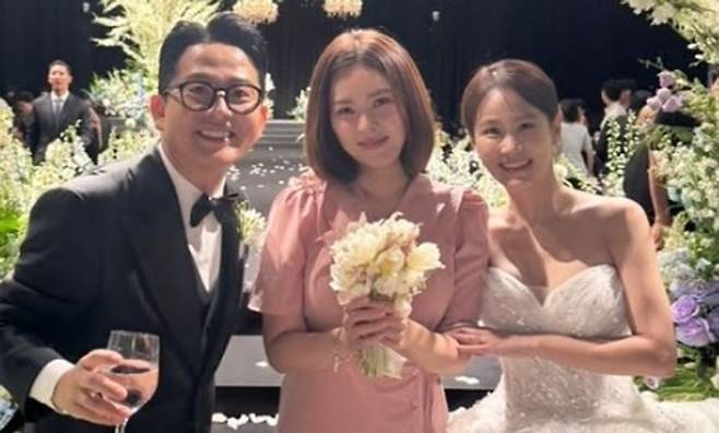 공개된 사진엔 김준호 김지민 부부 사이에서 부케를 든 채로 밝게 미소 짓고 있는 한윤서의 모습이 담겼다.