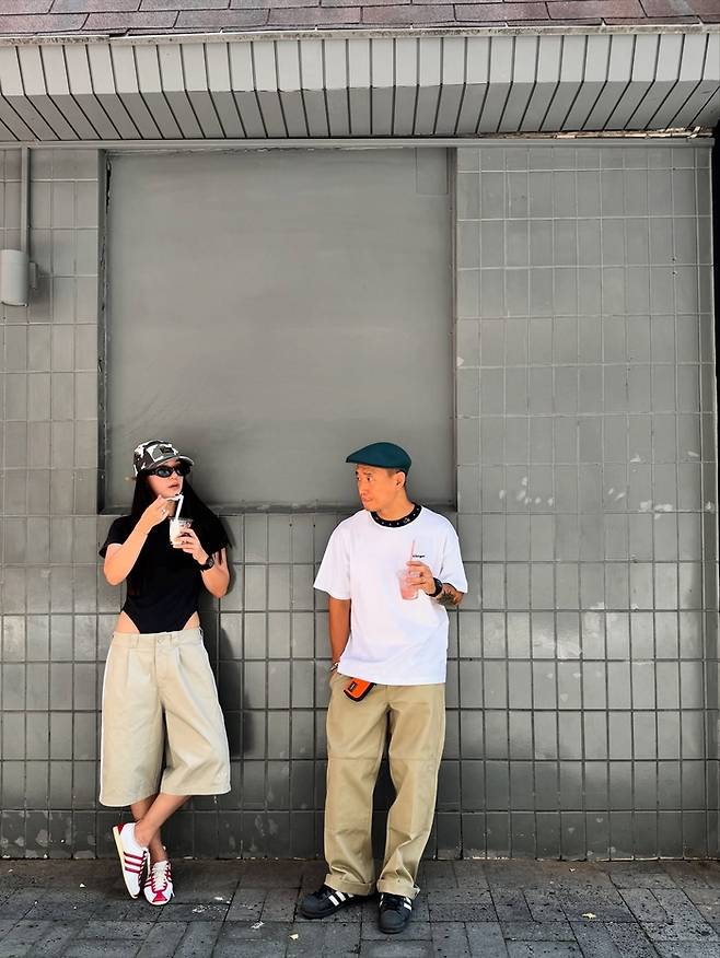 두 사람 모두 베이지 컬러의 팬츠와 스트릿 무드가 느껴지는 아이템으로 개성을 드러냈다.