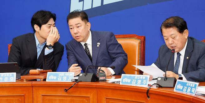 | “尹 드론사, 北에 무인기 침투 확인돼” 더불어민주당 김병기 당대표 직무대행 겸 원내대표가 14일 서울 여의도 국회에서 열린 최고위원회의를 주재한 가운데 김병주 최고위원이 드론작전사령부의 무인기 북한 침투 의혹을 제기하고 있다. 왼쪽부터 한준호 최고위원, 김 직무대행, 김 최고위원. 뉴스1 |