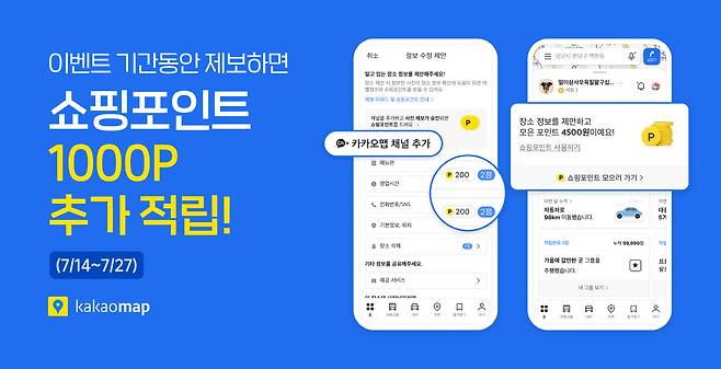 카카오맵이 이용자 참여 기반의 정보 제보형 서비스 '제보리워드'를 오픈, 7월 27일까지 이벤트를 진행한다고 14일 밝혔다.