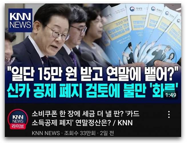 | ▲ 부산경남지역 민영방송인 KNN은 지난 12일 <"일단 15만 원 받고 연말에 뱉어?" 신카 공제 폐지 검토에 불만 '화륵'>에서 “이재명 정부가 조만간 신용카드 소득공제 제도 폐지를 포함한 조세제도 개편 논의를 본격화할 것으로 알려졌다”고 보도했다. |