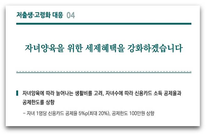 <한국경제>는 지난 7일('당정, 다자녀가구 카드공제 확대 검토') "6일 정치권 등에 따르면 기획재정부는 최근 국정기획위원회 업무보고에서 이 같은 방향의 세제 개편 방안을 보고한 것으로 알려졌다"라면서 "이재명 대통령이 대선 후보 시절 내놓은 '자녀 수에 비례한 신용카드 소득공제율·공제 한도 확대' 공약과 맞물린다"라고 보도했다.