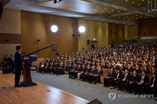 (서울=연합뉴스) 이재명 대통령이 14일 충북 진천 국가공무원인재개발원에서 70기 5급 신임관리자과정 교육생들을 대상으로 특강을 하고 있다. 2025.7.14 [대통령실 제공. 재판매 및 DB 금지]