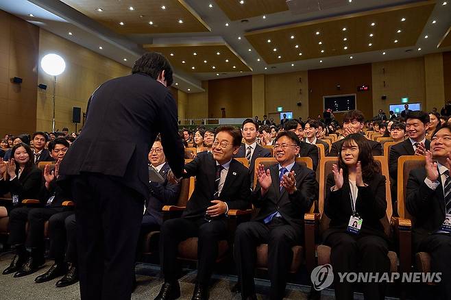 저서에 서명 뒤 교육생과 인사하는 이재명 대통령