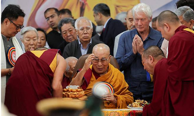 | 90번째 생일 지난 6일(현지시간) 90번째 생일을 맞은 티베트의 정신적 지도자 달라이 라마(가운데)가 인도 북부 다람살라 인근 티베트 불교 사원에서 승려와 신자들의 축하를 받고 있다. 다람살라=로이터연합뉴스 |