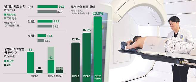 치료 성과는 숫자로도 입증됐다. 2015년부터 2019년까지 이 병원의 간암 상대 생존율은 39.9%로, 국내 평균인 37.7%보다 높게 나타났다. 담도암의 경우 세브란스는 29.2%, 국내 평균은 28.5%였다. 췌장암 생존율 역시 16.5%로, 국내 평균(13.9%)을 웃돌았다.