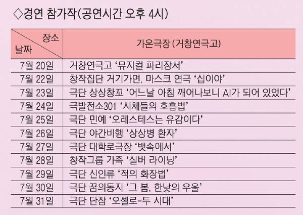 연극제 공식 개막에 앞서 20일 거창연극고 학생들의 특별공연 뮤지컬 '파리장서'를 시작으로 31일까지 거창연극고 내 가온극장에서는 경연 참가자들이 차례로 무대에 오른다. 창원 극단 상상창꼬의 '어느날 아침 깨어나보니 AI가 되어 있었다'를 비롯해 다양한 국내 작품 11편이 차례로 관객을 만난다.