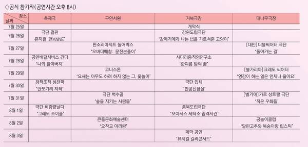 연극제는 크게 개폐막 공연을 비롯해 공식 참가작과 경연참가작, 프린지 공연으로 나뉜다.