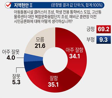 14일 중부일보 의뢰로 여론조사기관 데일리리서치가 의정부시 거주 만 18세 이상 남녀 503명을 대상으로 지난 9일부터 10일까지 이틀간 실시한 여론조사 결과(95% 신뢰수준에 오차범위 ±4.4%p)에 따르면 '고산동 물류센터 대안 복합문화융합단지 조성, 아동돌봄시설 클러스터 조성, 학생 전용 통학버스 도입, 예비군 훈련장 이전 시민공론화에 대해 어떻게 생각하는가'라는 질문에 의정부시민 69.2%가 긍정 답변을 내놨다.