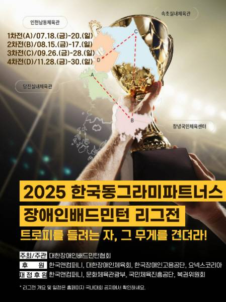 ○…2025년 한국동그라미 파트너스 장애인배드민턴 리그가 18일부터 20일까지 충남 당진실내체육관에서 1차전을 시작으로 5개월간의 일정에 돌입한다. 올해 처음 열리는 이번 리그는 국내 장애인배드민턴의 저변 확대를 목표로 한다. 당진(7월), 창녕(8월), 속초(9월), 인천(11월) 4개 지역에서 순차적으로 개최된다. 리그는 선수부와 동호인부로 나뉜다. 성적에 따라 상금이 지급된다. 선수부는 1위 500만원, 2위 300만원, 3위 100만원이다. 동호인부는 1위 300만원, 2위 200만원, 3위 100만원이 수여된다. 일부 개인 시상도 함께 진행될 예정이다.
