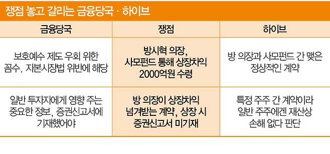 금융당국과 투자 업계에 따르면, 방 의장은 하이브 상장(IPO) 직전 2020년쯤 자신과 가까운 하이브 간부들이 설립한 사모펀드와 상장 이후 주식 매각 차익의 30%를 넘겨받는 계약을 체결했다. 그러나 정작 외부 투자자에게는 “상장 계획이 없다”고 알려 높은 가격에 매입해주겠다며 하이브 주식을 해당 사모펀드에 팔도록 유도했다. 최대주주 지분과 달리, 통상 소수주주 지분은 기업공개 외 회수 수단이 마땅치 않다. 이후 상장이 이뤄지자 사모펀드는 주식을 매각해 막대한 차익을 얻었고 방 의장은 이 가운데 약 2000억원을 정산받은 것으로 알려진다.