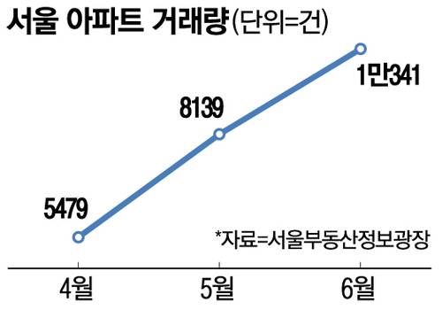 문제는 이런 경우가 상당할 것으로 예상된다는 점이다. 이날 서울부동산정보광장에 따르면 지난 6월 서울아파트 매매 거래는 1만341건으로 집계됐다. 5월 거래량도 8139건에 이른다. 거래 중엔 생애최초 주택 매입도 있지만, 갈아타기를 위한 거래도 많아 대출 규제에 애꿎은 피해를 입은 실수요층이 상당할 것으로 예상된다. 한편 부동산 플랫폼 직방이 국토교통부 실거래가 자료를 분석한 결과, 6·27 대출 규제 발표 이후 2주 동안 서울 아파트 최고가 거래량은 발표 직전 2주 대비 74% 감소했다.