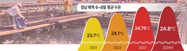 올해 경남은 고수온으로 역대급 피해를 보았던 지난해(8월 2일)보다 24일 빠른 지난 9일 사천만과 강진만에서 고수온 주의보가, 나머지 전 해역에 고수온 예비특보가 발령됐다.