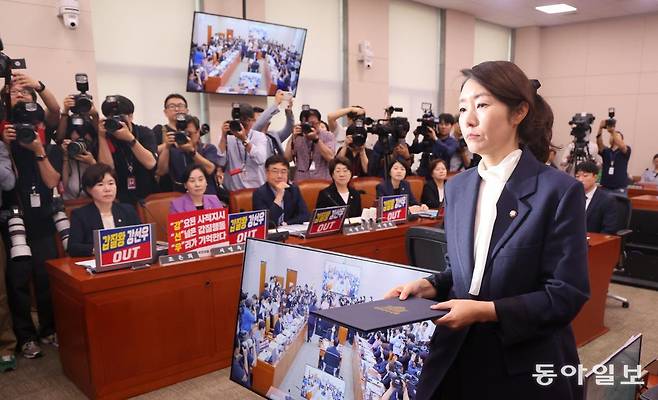 | 與野, 인사청문회 첫날부터 격한 대치 강선우 여성가족부 장관 후보자(오른쪽)가 14일 국회 인사청문회에서 선서문을 전달하기 위해 여성가족위원장석으로 향하고 있다. 이날 청문회에서 국민의힘은 ‘보좌관 갑질 의혹’을 부각하기 위해 ‘갑질왕 강선우 아웃(OUT)’ 등의 피켓을 노트북에 내걸었다. 그러자 더불어민주당이 이를 떼라고 강하게 요구하는 등 여야는 청문회 초반 고성 속에 대치하기도 했다. 장승윤 기자 tomato99@donga.com |