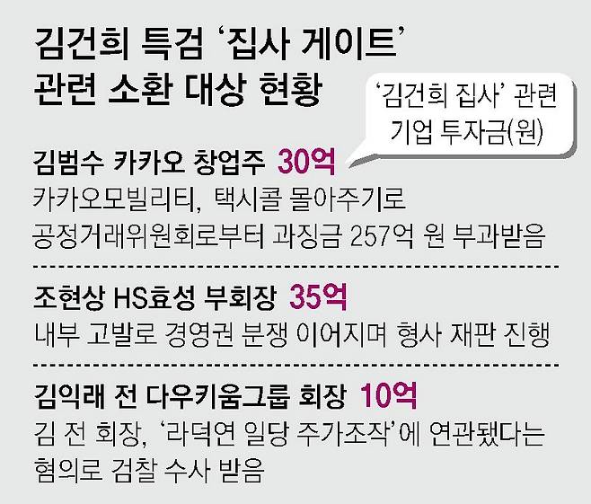 특검은 이들이 당시 각종 형사사건과 오너 리스크를 무마하기 위해 이른바 '김건희 집사'로 알려진 김모 씨 관련 기업에 '보험성 투자'를 했는지 확인할 방침이다.
