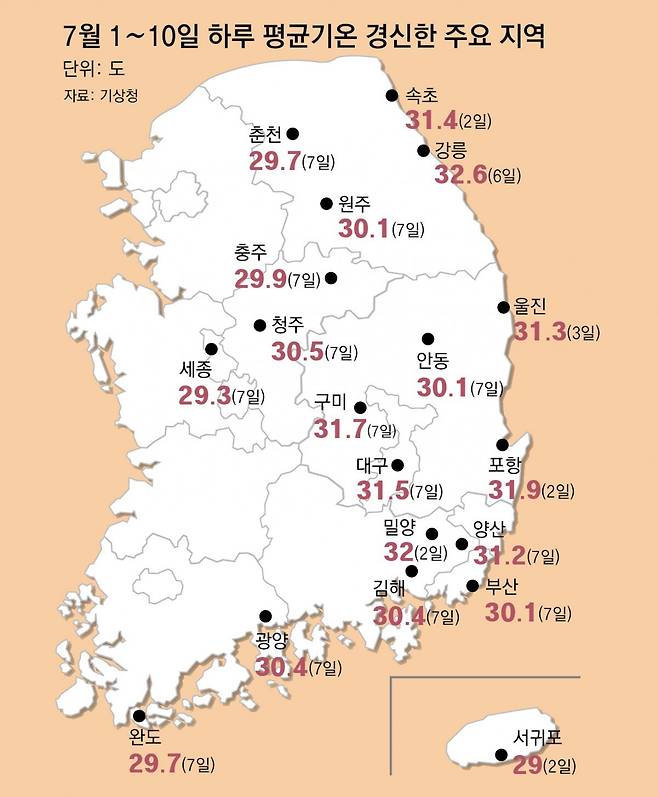 이후에도 더위가 이어졌다. 8일 오후 2시께 서울 기온이 37.1도까지 오르면서 근대적인 기상관측을 시작한 이래 7월 상순(1∼10일) 기온으로는 역대 최고치를 기록했다. 과거 이 기간 서울 최고기온은 1939년 7월 9일 기록된 36.8도였다. 이명인 UNIST 폭염연구센터장은 “한반도에 폭염을 불러 온 북태평양 고기압은 열대 서부 해역의 높은 해수면 온도에 영향을 받는다”며 “기후 변화가 심각해질수록 북태평양 고기압 영향력이 더욱 강해질 수 있다”고 말했다.