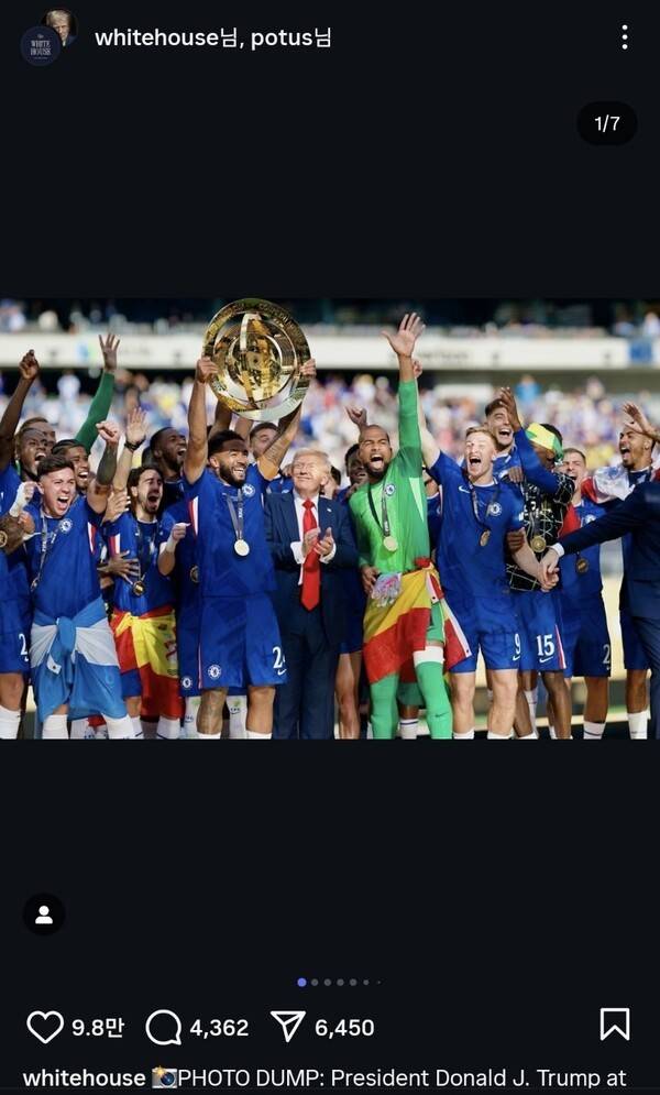 [SPORTALKOREA] 김경태 기자= 도널드 트럼프 미국 대통령의 '돌발 행동'이 축구 팬들의 공분을 사고 있다. 첼시의 2025 국제축구연맹(FIFA) 클럽 월드컵(CWC) 대관식에 끝까지 센터를 차지한 것도 모자라 백악관 공식 사회관계망서비스(SNS)에 까지 이를 업로드해 분노의 여론이 들끓고 있다.