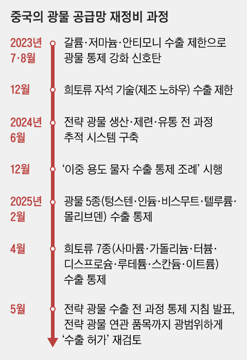 중국은 2010년대부터 희토류 기업들을 대대적으로 합병시켜 채굴부터 가공까지 중앙 통제가 가능하게 했다. 지난해 ‘광둥희토’를 흡수한 남부의 ‘중국희토(中國稀土)’와 북부의 ‘북방희토(北方稀土)’ 두 곳이 광산 채굴과 제련·분리 작업에 대한 생산 쿼터를 독점하고 있다. 중국은 2023년에는 광물 수출 기업들이 수출 전 거래 내역·고객 정보·거래량까지 의무 보고하게 하는 ‘추적 시스템’을 도입했다. 작년에는 희토류 생산 전 과정 추적 체계를 구축했다. 지난 2월에는 광물 관련 기술 유출을 강도 높게 단속해 중국 기업이 자발적으로 ‘리튬 추출용 여과 장치’의 수출을 중단했다.