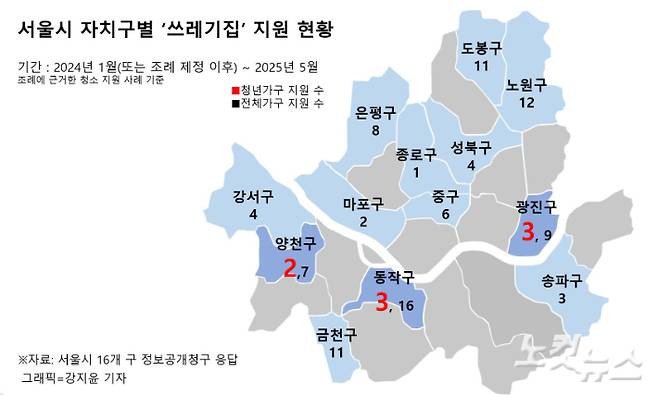 청년 가구 지원이 이뤄진 곳은 △양천구 2가구 △동작구 3가구 △광진구 3가구로 폐기물 수거, 주거환경 개선, 사후관리 등의 지원을 받은 것으로 파악됐다.