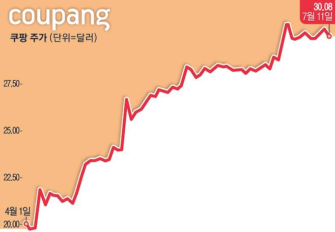 지난 11일 뉴욕증권거래소에 따르면 이날 종가 기준 쿠팡 주가는 30.08달러로 올 4월 초 기록한 연저점(19.76달러) 대비 3개월 새 50% 이상 급등했다.