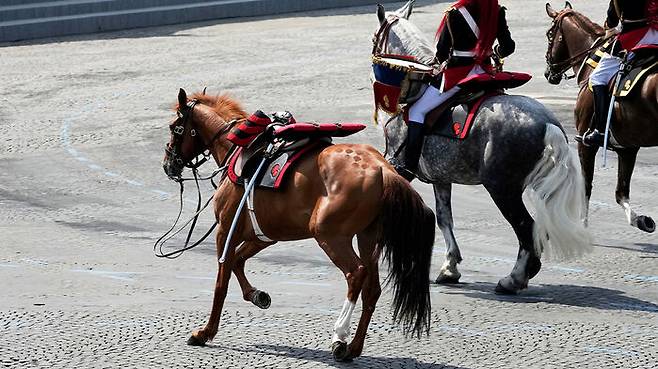 ▲ 14일(현지시간) 프랑스 혁명기념일 군사 행진 도중 기병 연대 소속 말 한 필이 기병 없이 홀로 행진하고 있다.