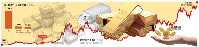 비트코인 가격이 사상 처음으로 12만 달러를 돌파한 14일 글로벌 시가총액이 2조 4340억 달러까지 불어난 것으로 집계됐다. 시총 집계 플랫폼인 컴퍼니즈마켓캡에 따르면 비트코인 시총은 금(22조 6310억 달러)의 약 9분의 1 수준이지만 대표적 안전자산인 은(2조 2190억 달러)을 앞선다. 비트코인 앞에도 엔비디아(4조 2200억 달러)와 마이크로소프트(3조 7400억 달러), 애플(3조 1530억 달러) 정도만 있을 뿐이다. 비트코인이 글로벌 시총 5위인 것이다.