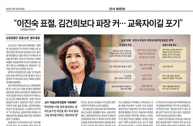 한국사립대교수회연합회 등 11개 교수·학술단체가 참여한 '범학계 국민 검증단'이 이진숙 부총리 겸 교육부 장관 후보자의 논문 150 편 중 16편에서 연구윤리 위반 문제를 발견했다고 발표했다. 검증단은 윤석열 전 대통령 부인 김건희의 논문 표절을 밝혀낸 교수들의 임의 단체다.