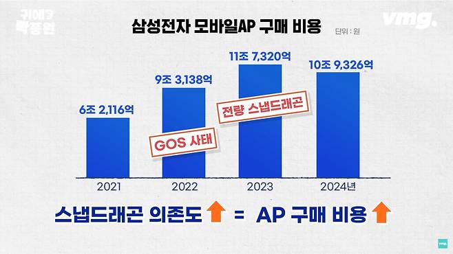 일단 삼성전자를 둘로 나눠서 볼 필요가 있어요. 스마트폰 부문과 반도체 부문입니다. 스마트폰 부문을 보면은 갤럭시 S3 때부터 자사 엑시노스와 경쟁사인 미국 퀄컴이 만든 스냅드래곤을 AP로 병행을 해서 쓰고 있었거든요. 항상 소비자 선호도는 솔직히 스냅드래곤이 좀 더 높았어요. 그러다가 'GOS 사태'가 터지고 엑시노스를 쓸 수가 없잖아요. 갤럭시 S23, 여기서 처음으로 삼성전자가 자기네가 만든 엑시노스를 하나도 못 쓰고 전부 스냅드래곤을 갖다가 사다 썼거든요. 이때부터 삼성전자의 AP 구매 비용이 엄청나게 올라갑니다. 스냅드래곤의 의존도가 높아질수록 삼성전자의 스마트폰 부문이 쓰는 비용도 늘어나는 거예요. 이러다 보니까 비용 절감 측면에서도 되도록이면 좀 엑시노스를 많이 쓰려고 하는 경향이 있고요.