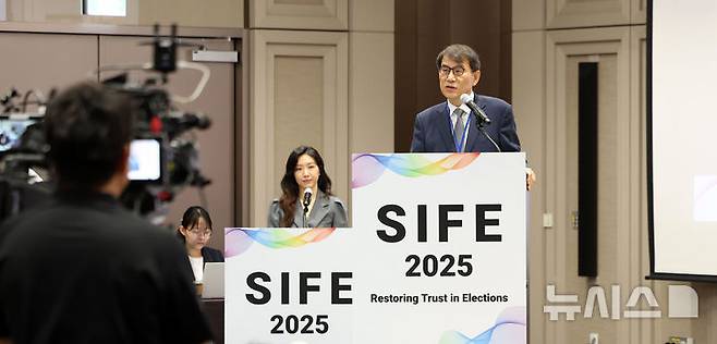[서울=뉴시스] 김선웅 기자 = 노태악 중앙선거관리위원장이 15일 서울 강남구 코엑스에서 '선거 신뢰의 회복'을 주제로 제28회 세계정치학회 총회 연계로 열린 2025 서울 국제선거포럼에서 개회사를 하고 있다. 2025.07.15. mangusta@newsis.com