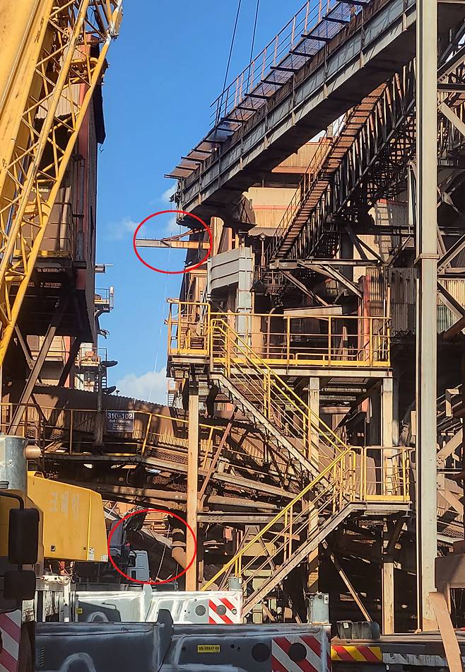 | ▲ 지난 14일 전남 광양시 금호동 포스코 광양제철소 내 소결공장에서 발생한 추락 사고로 철거업체 소속 60대 노동자 1명이 숨지고 2명이 다쳤다. 빨간색 원은 사고를 당한 근로자들이 추락한 지점. |