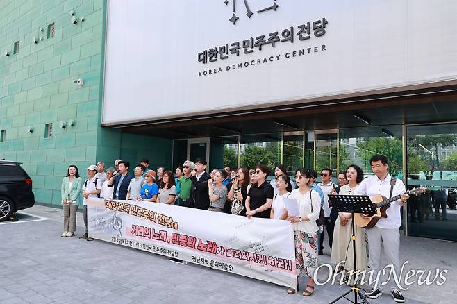 | ▲ 경남지역 문화예술인들은 7월 3일 오전 창원마산 대한민국민주주의전당 앞에서 기자회견을 열어 민중가요 기록을 요구하면서 <아침이슬>과 <동지여 내가 있다>(김영만 작사작곡)를 불렀다. |
