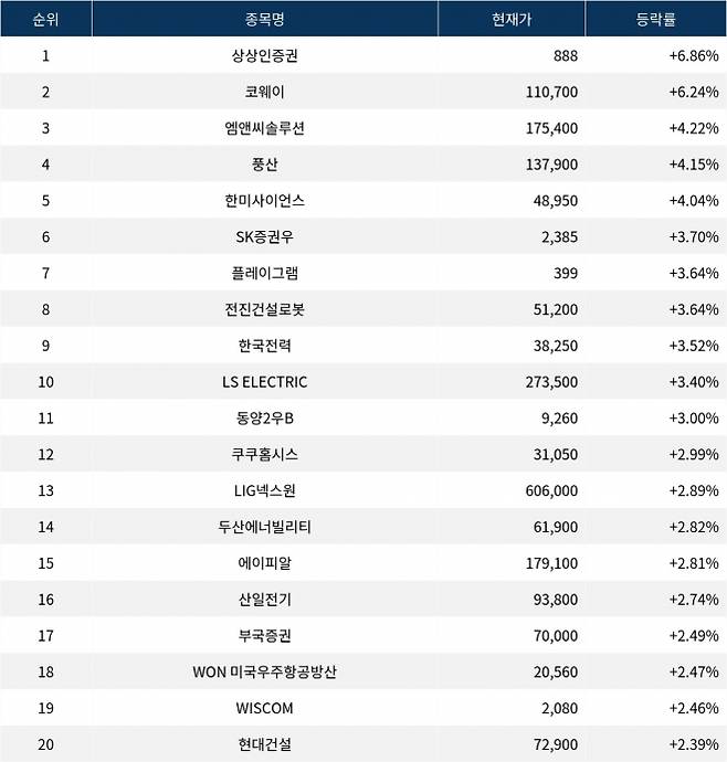 6위 SK증권우(001515)는 현재가 2,385원으로 3.70% 상승 중이다. 7위 플레이그램(009810)은 현재가 399원으로 3.64% 상승 중이다. 8위 전진건설로봇(079900)은 현재가 51,200원으로 3.64% 상승 중이다. 9위 한국전력(015760)은 현재가 38,250원으로 3.52% 상승 중이다. 10위 LS ELECTRIC(010120)은 현재가 273,500원으로 3.40% 상승 중이다.