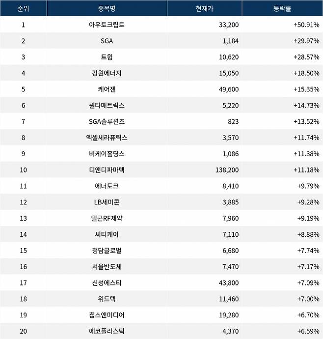 6위 퀀타매트릭스(317690)는 현재가 5,220원으로 14.73% 상승 중이다. 7위 SGA솔루션즈(184230)는 현재가 823원으로 13.52% 상승 중이다. 8위 엑셀세라퓨틱스(373110)는 현재가 3,570원으로 11.74% 상승 중이다. 9위 비케이홀딩스(050090)는 현재가 1,086원으로 11.38% 상승 중이다. 10위 디앤디파마텍(347850)은 현재가 138,200원으로 11.18% 상승 중이다.