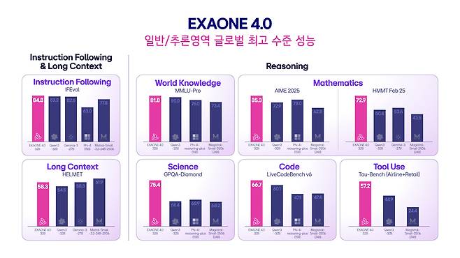 엑사원 4.0은 AI 모델의 성능을 평가하는 벤치마크 비교에서 MMLU-Redux/MMLU-Pro(AI의 지식수준과 문제 해결 능력 평가) 92.3점/81.8점, LiveCodeBench v6(코딩 능력 평가) 66.7점, GPQA-Diamond(과학 문제 해결 능력 평가) 75.4점, AIME 2025(수학 문제 해결 능력 평가) 85.3점을 기록하면서 미국과 중국, 프랑스의 대표 오픈 웨이트 모델을 제치고 세계 최고 수준 성능을 입증했습니다.