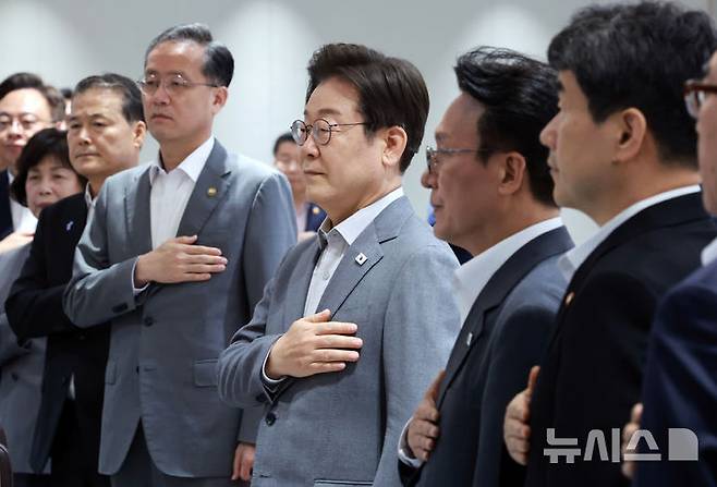 [서울=뉴시스] 최동준 기자 = 이재명 대통령이 15일 서울 용산 대통령실 청사에서 열린 국무회의에서 국민의례를 하고 있다. (대통령실통신사진기자단) 2025.07.15. photocdj@newsis.com